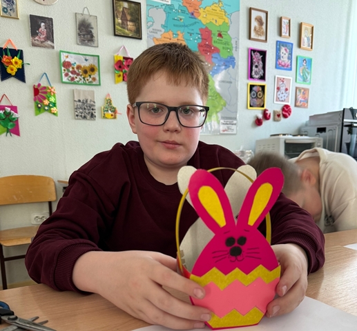 Особое внимание ребята уделили изготовлению оригинальной корзинки для яиц в форме зайца — одного из главных символов Пасхи российских немцев. Каждый участник мастер-класса проявил фантазию: корзинки украшали разноцветными яйцами, весенними цветами, лентами и декоративными элементами. Атмосфера была наполнена радостью, смехом и творческим азартом.
