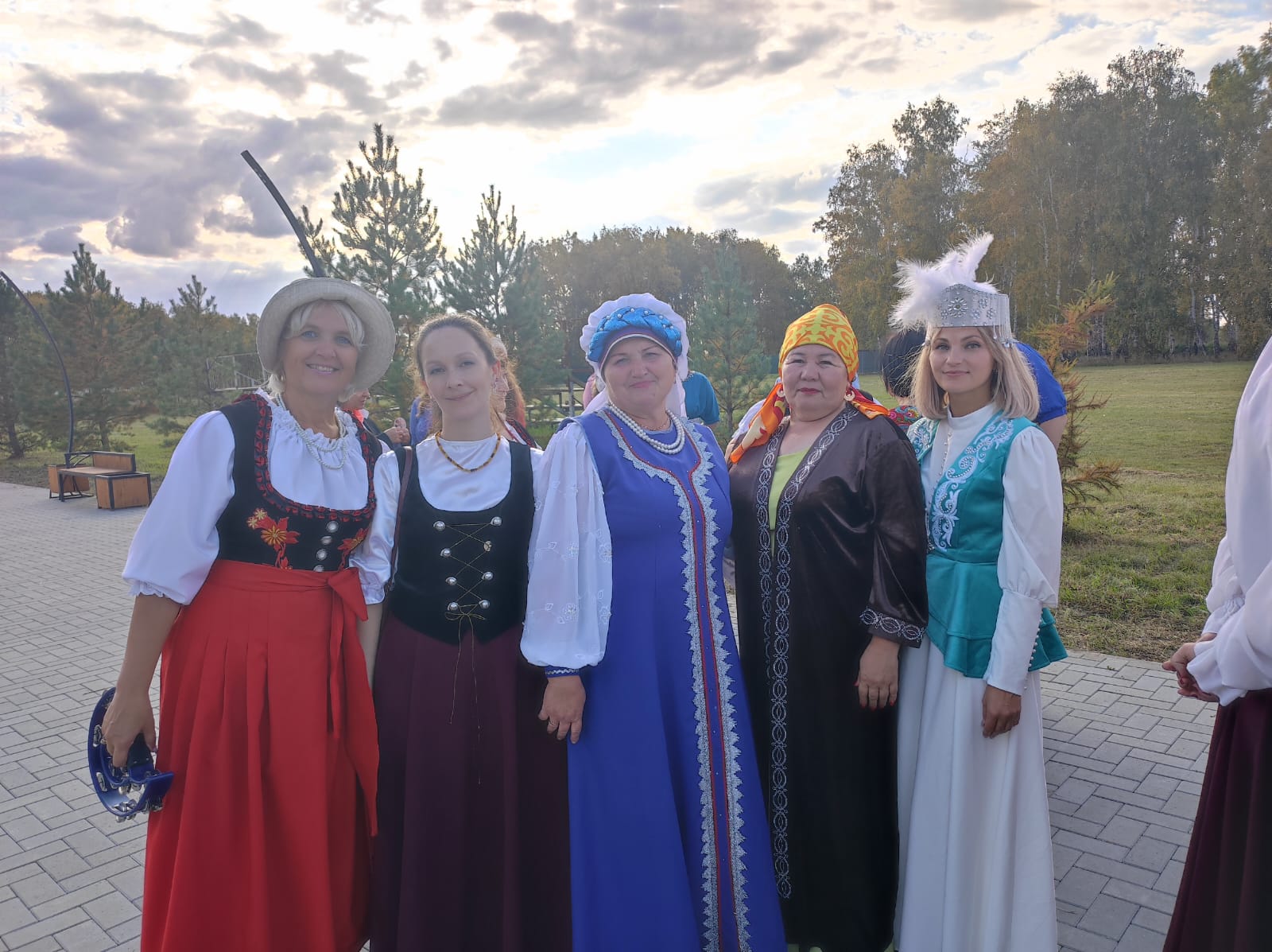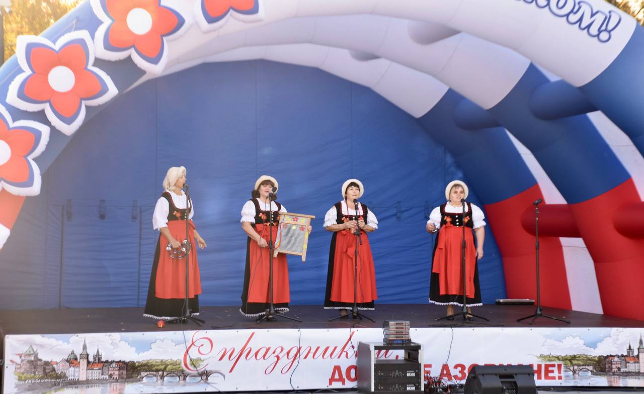 Немецкая составляющая праздничной концертной программы была представлена образцовым ансамблем танца «Бэхляйн» из Азово, народными вокальными ансамблями «Хайматланд» из Александровки, «Нахтигаль» из Шербакульского района, «Одесситы» из с. Одесское, «Розинэ» из г. Омска, шумовым ансамблем «Глёкхен» и вокальным ансамблем «Нельке» из Звонаревокутского сельского поселения.