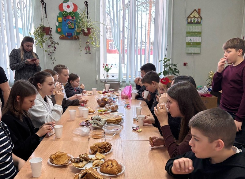 Одним из ключевых моментов празднования стало чаепитие. После активных развлечений дети собрались вокруг стола с угощениями, включая традиционные русские блины. Горячий чай с вареньем стал отличным дополнением к праздничному столу.